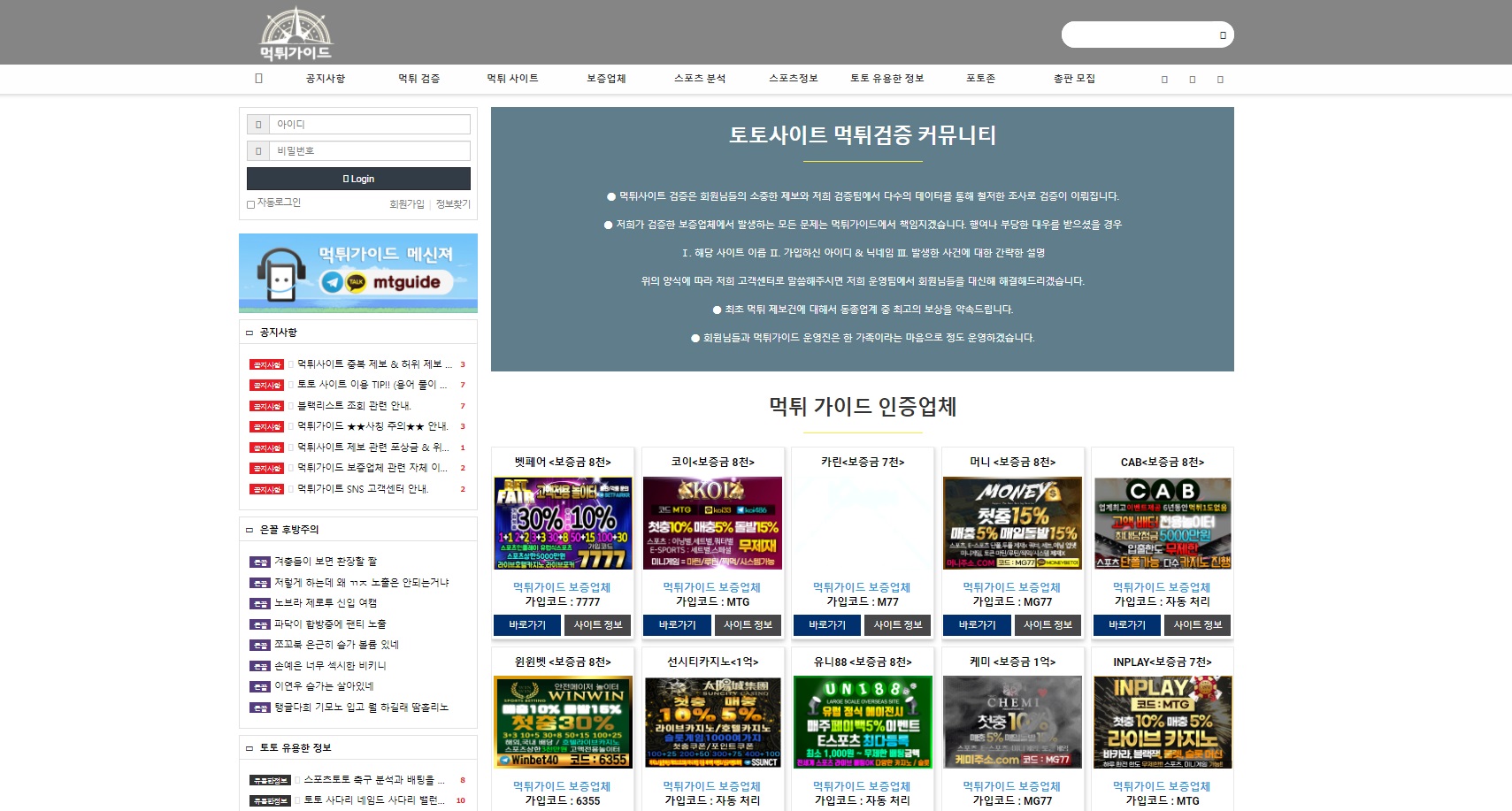 뿐만 아니라 "사설 토토사이트 업계에 100% 안전은 없다" 는 생각에 혹시나 발생할 수 있는 사고의 가능성을 염두하여 선 보증금 제도를 통해 보증금을 예치한 안전한 보증업체를 소개해드리고 있습니다.끊임 없이 생기는 먹튀 사이트들이 정말 많기에 유저분들도 구글 및 타 커뮤니티 인터넷 정보를 최대한 활용하여 해당 사이트에 대한 정보를 충분히 파악 후 이용을 하시는 것이 맞습니다.