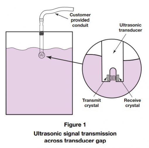 Ultrasonic energy detects the presence or absence of liquid in a tip sensitive transducer gap. The principle behind contact ultrasonic technology is that high frequency sound waves are easily transmitted across a transducer gap in the presence of liquid, but are attenuated when the gap is dry.The transducer uses a pair of piezoelectric crystals that are encapsulated in epoxy at the tip of the transducer. The crystals are made of a ceramic material that vibrates at a given frequency when subjected to an applied voltage. The transmit crystal converts the applied voltage from the electronics into an ultrasonic signal. When liquid is present in the gap, the receive crystal is able to sense the ultrasonic signal from the transmit crystal and convert it back to an electrical signal. This signal is sent to the electronics to indicate the presence of liquid in the transducer gap. When there is no liquid present, the ultrasonic signal is attenuated and is not detected by the receive crystal.