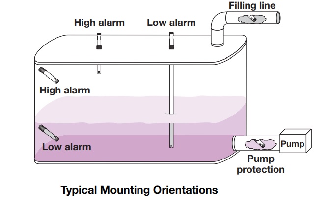 The Model 940/941 can be applied in a wide variety of high or low liquid level applications, pump protection,and fill line monitoring as shown in the diagram at the left. These compact units can also be installed in the interstitial space between two tank walls for fluid leak detection.Small size and simplicity of installation make these units ideal for OEM skids as a low cost, yet high performance level measurement solution. They are also the perfect replacement for older floats, conductivity switches, and tuning forks.