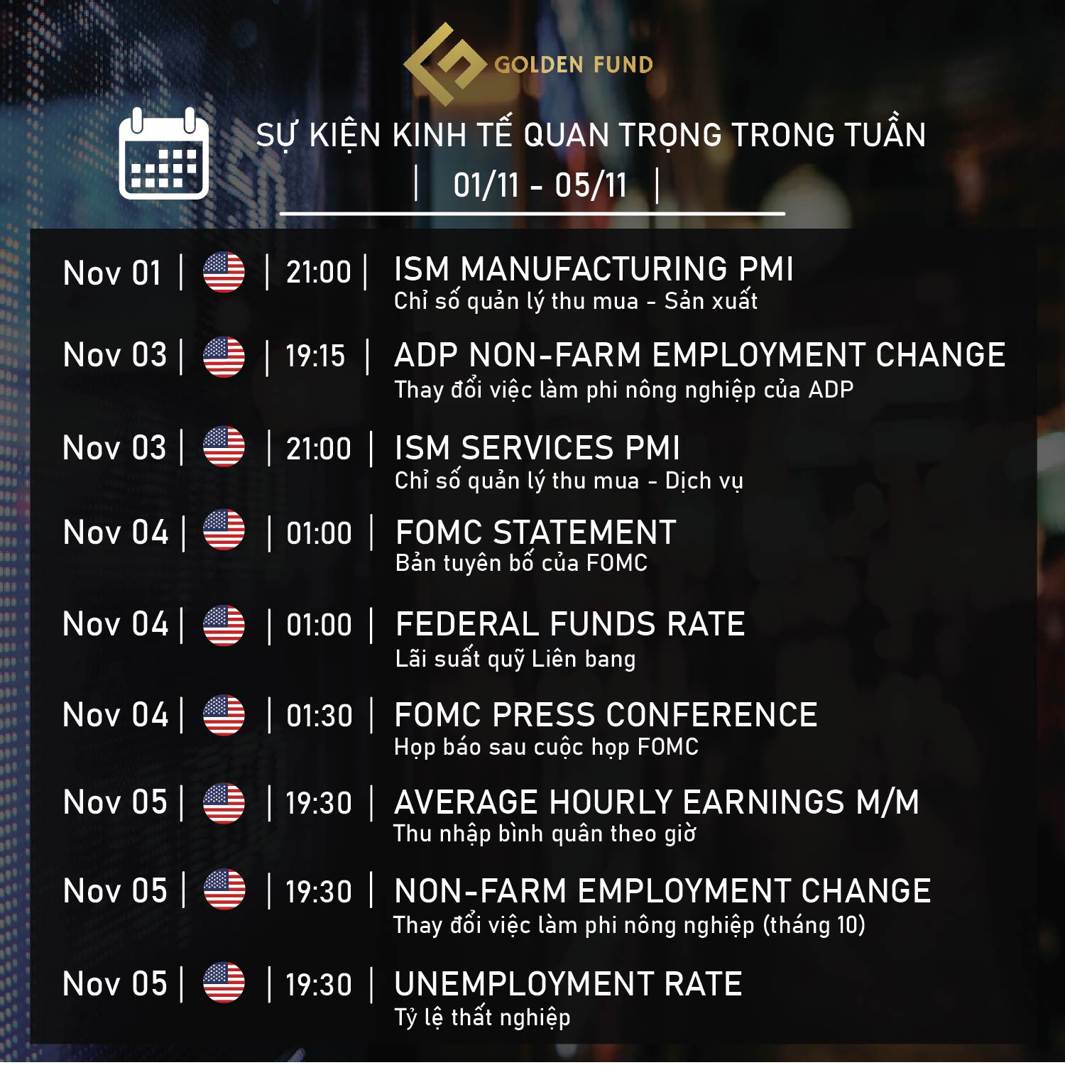 TIN TỨC QUAN TRỌNG ẢNH HƯỞNG GIÁ VÀNG TUẦN TỚI (01/11 - 05/11)Trong tuần tới, thị trường sẽ đón nhận rất nhiều tin tức quan trọng có mức độ tác động lớn tới giá Vàng.