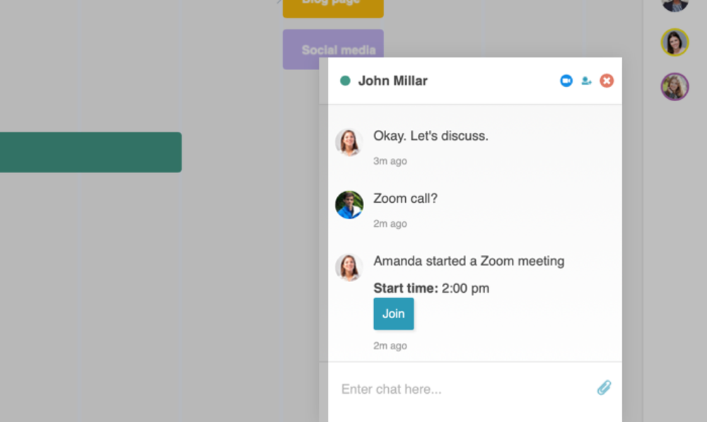 Built in integration tools make it simple to invite teams members to a Zoom meeting. One click on the Zoom icon is all it takes.