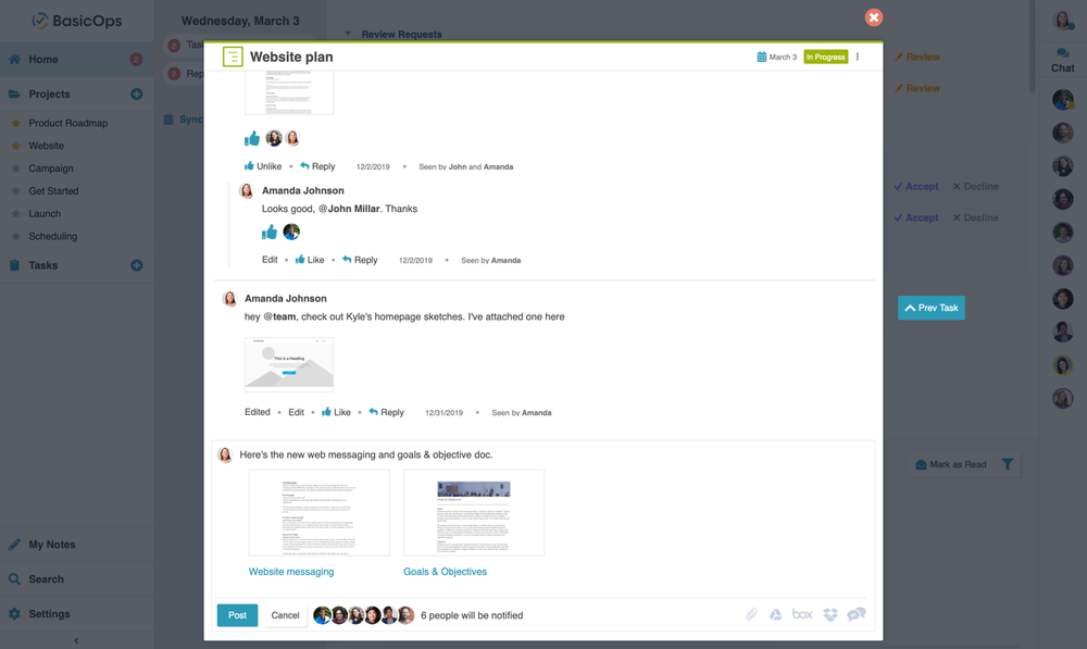 A single click is all it takes to Like, Reply, or mark tasks as Complete, eliminating the need for tracking down team members to check on important information. With the “at a glance” views built into BasicOps you can stay on top of tasks, projects, and your team activities.