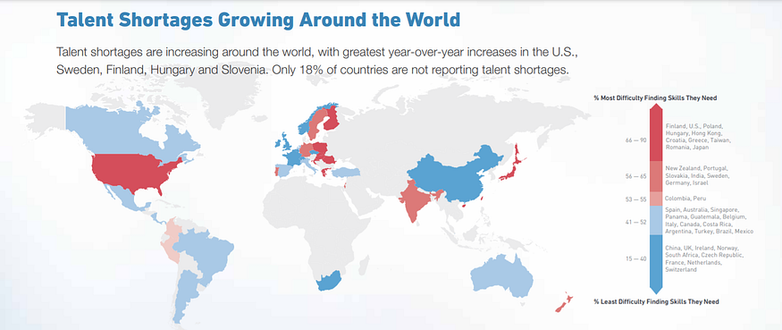 Due to the Skills Gap report, the most dangerous situation with an expert shortage is in the United States, Sweden, Hungary, Poland, and Slovenia. Only 18% of respondents do not report talent lack within their countries.