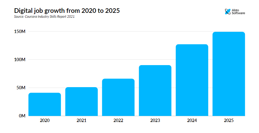 Digital employment will expand to 190 million by 2025, according to Coursera.