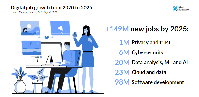 There will be 98 million new jobs for software development specialists, cloud and data positions for 23 million, and data analysis, machine learning, and AI-connected roles — for 20 million professionals.