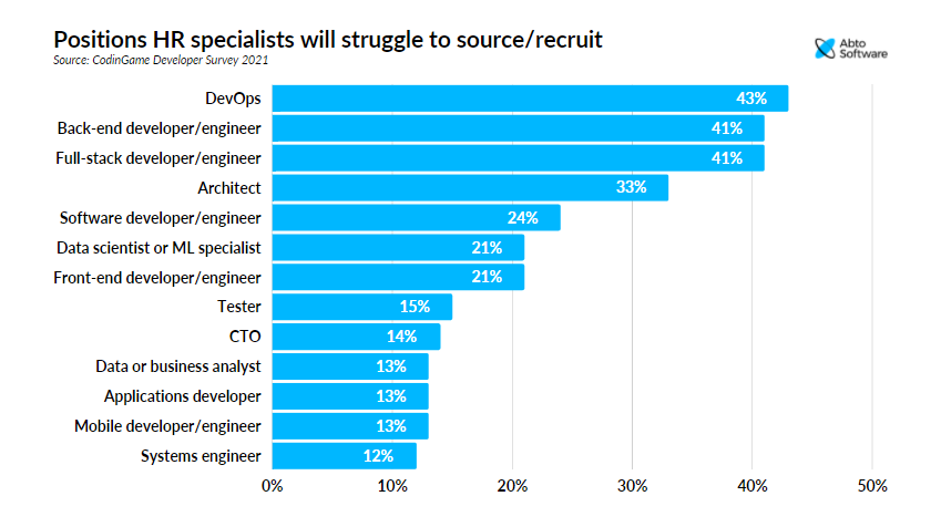 43 percent of respondents in CodinGame research think it will be even more problematic to fill in DevOps positions during the next several years. 41% of HR specialists agree on difficulties with recruiting back-end and full-stack developers as well.