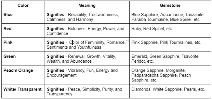 As mentioned before, millennials love popping colors in their jewelry. Brides-to-be want to have a memorable and larger-than-life meaning attached to their color gemstone engagement ring. Below we have mentioned colors, what they signify and what gemstones you can choose for your big day!