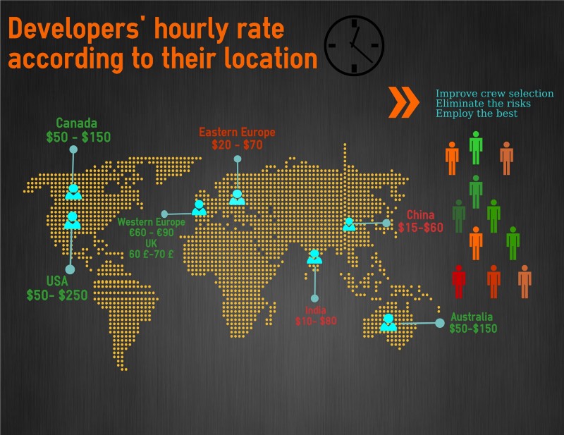 Do you think the location of your proposed mobile app development company has a striking influence on the overall costs and the app development approach? Of course, it has. The app development quote is usually based on hourly rates, which vary according to the geographic location of the company. Irrelevant to the location of the preferred company, you will definitely end up paying more if you prefer to choose a client-centric company. As per the standard rates in December 2015, here is the hourly rate list in different regions of the world.