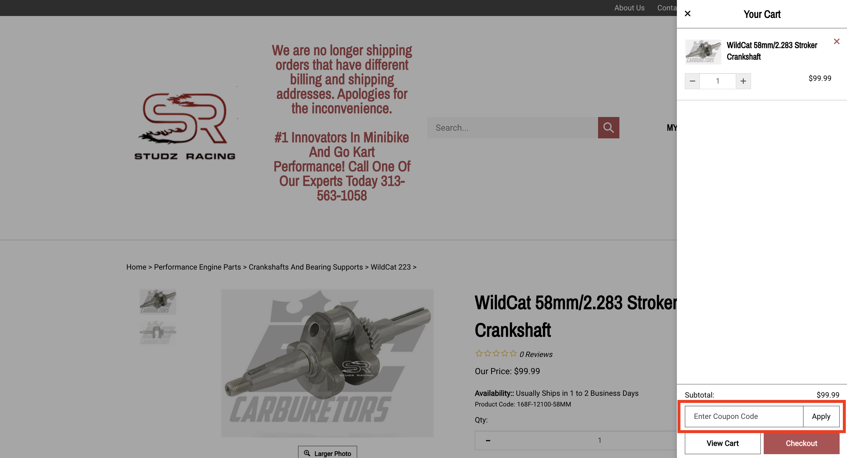 To use a discount code at Studz Racing, simply add your desired items to your shopping cart and proceed to checkout. On the checkout page, you'll see a field where you can enter the discount code. Enter the code and click "apply" to see the discount applied to your order. Be sure to check the terms and conditions of the discount code to ensure it can be used on the items you wish to purchase.