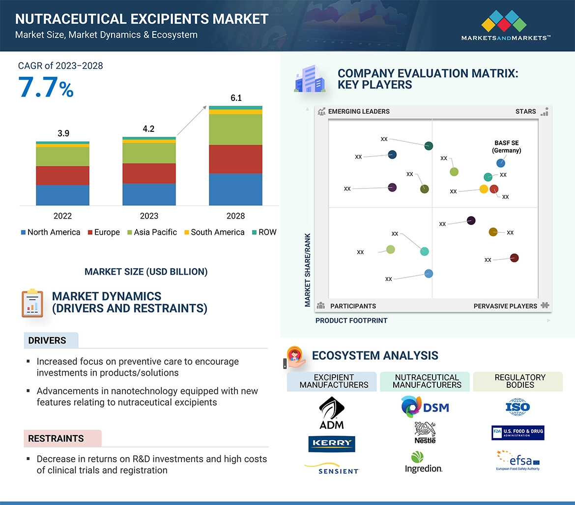 The global nutraceutical excipients market is on a strong growth trajectory, expected to expand from USD 4.2 billion in 2023 to USD 6.1 billion by 2028, registering a CAGR of 7.7% during this period. This growth mirrors the booming popularity of nutraceuticals, which are increasingly recognized for their role in supporting health and managing a wide array of conditions—from heart disease and cancer to insomnia, memory issues, gastrointestinal problems, and stress-related headaches and migraines.
