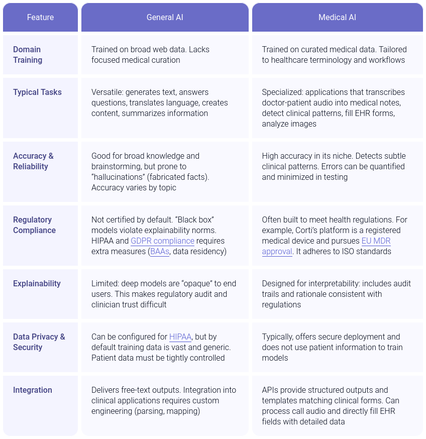 Medical Artificial Intelligence systems are purpose-built for the complexities of modern healthcare applications. They are often fine-tuned on clinical data and designed to understand medical terminology, comply with strict regulatory frameworks, and integrate into clinical workflows with explainable insights. This specialized focus enables higher accuracy and safety in clinical contexts.