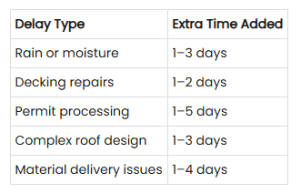Note: Hidden structural issues like rot or mold discovered after tear-off can add 1–3 extra days to installation timelines.