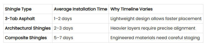 Roof installation timelines can shift significantly depending on the shingle material you select, since weight, layering requirements, and installation precision all affect crew speed and staging. Here’s a quick comparison showing how different shingle types influence project duration: