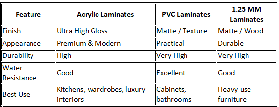 While materials like pvc laminate sheet, advance pvc laminate, and 1.25 MM laminates are widely used for durability and cost efficiency, acrylic laminates stand out for their premium finish and ultra-modern aesthetic.
