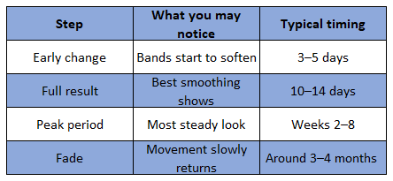 Most people do not see full results on day one. Instead, Botox usually starts to show in a few days. Then, the whole look often appears around 10 to 14 days. After that, results commonly last about 3 to 4 months, although some people see a shorter or longer window.
