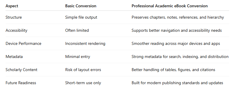 For academic monographs, this matters even more. These titles often include chapter hierarchies, footnotes, citations, tables, images, bibliographies, and sometimes complex layouts. If conversion is rushed or handled with a basic workflow, the result can feel broken to readers. Navigation may become confusing, formatting may shift between devices, and important scholarly elements may lose clarity.