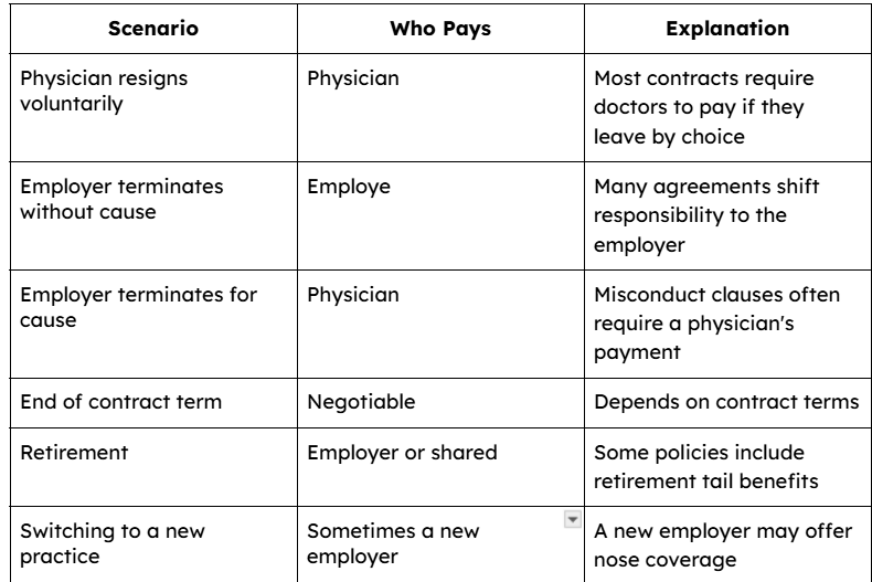 Below are the most common real-world scenarios that determine who pays for tail coverage malpractice insurance: