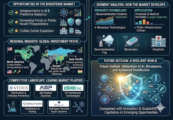 Modern biodefense strategies rely on a combination of advanced technologies such as biosensors, AI-driven analytics, UV-based disinfection, and decontamination systems. The Biodefense Market enables real-time monitoring, early threat detection, and efficient containment, which are essential for minimizing the impact of biological incidents.